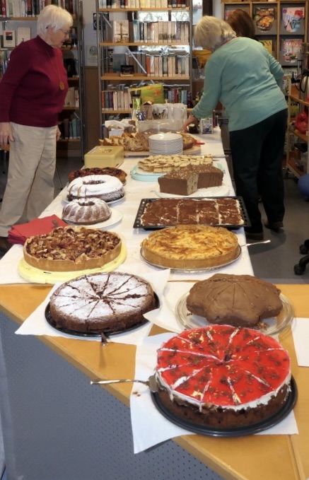 Sonntagnachmittag in der Bücherei in Pfäffingen: Ein geradezu opulentes Kuchenbuffet samt brodelnder Kaffeemaschine wartet auf die zahlreich eintreffenden Gäste. Im umgeräumten Hauptraum der Bücherei sind sämtliche Tische mit fröhlich Plaudern den oder Lesenden belegt. Hierzu ein Tässchen Kaffee und das ein oder andere Kuchenstück … herrlich. Im oberen Stockwerk ein Kinderprogramm mit dem Riesen Knurr und ähnlichen spannend vorgelesenen Geschichten. Ein Bücherflohmarkt im Carport von Frau Kümmerle (für die kälteresistenten LeserInnen) sowie im Gang des Rathauses bietet eine reichliche Literaturauswahl für Jung und Alt zum Schnäppchenpreis. Zudem noch einige Eintritte in den Freundeskreis, was wollen wir mehr?